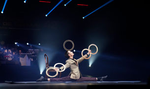 In this award-winning act rings are juggled against the ground. This completely new technique adds a distinctive dynamic to the performance and opens up new dimensions of juggling. The retro style gives this juggling performance a nostalgic charm. The carefully selected music in combination with his movement transports a fine and noble atmosphere. This act is elegant entertainment at its best.